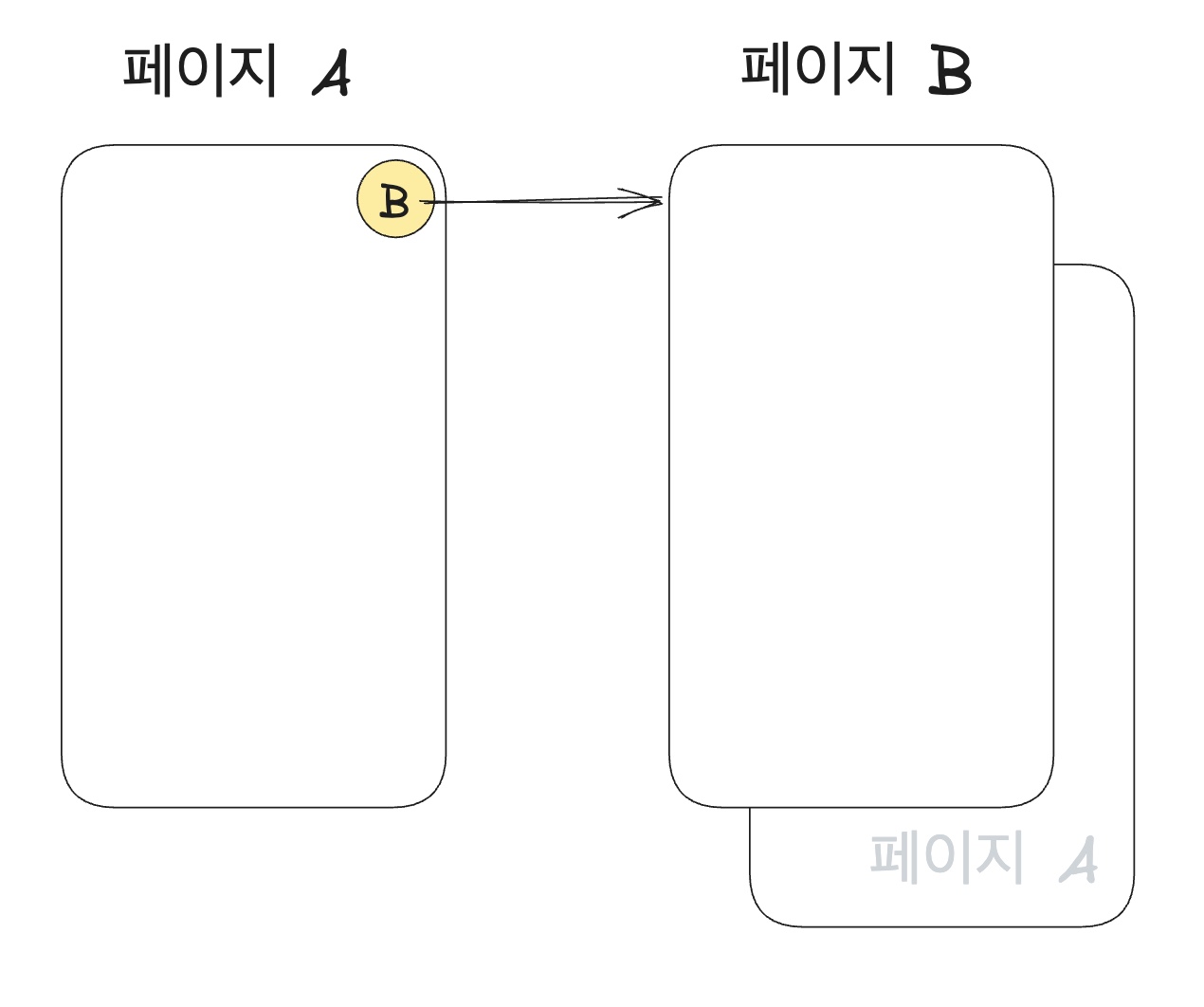 이 설명을 위해서는 간략히 서비스의 구조를 설명드려야 할 것 같은데요, 페이지A에는 페이지B로 들어갈 수 있는 진입점이 있어요. 페이지A와 페이지B는 모두 네이티브 위에 띄워진 웹뷰이고, 페이지A에서 페이지B로 진입하면 페이지A 위에 페이지B가 스택으로 쌓이는 구조예요.