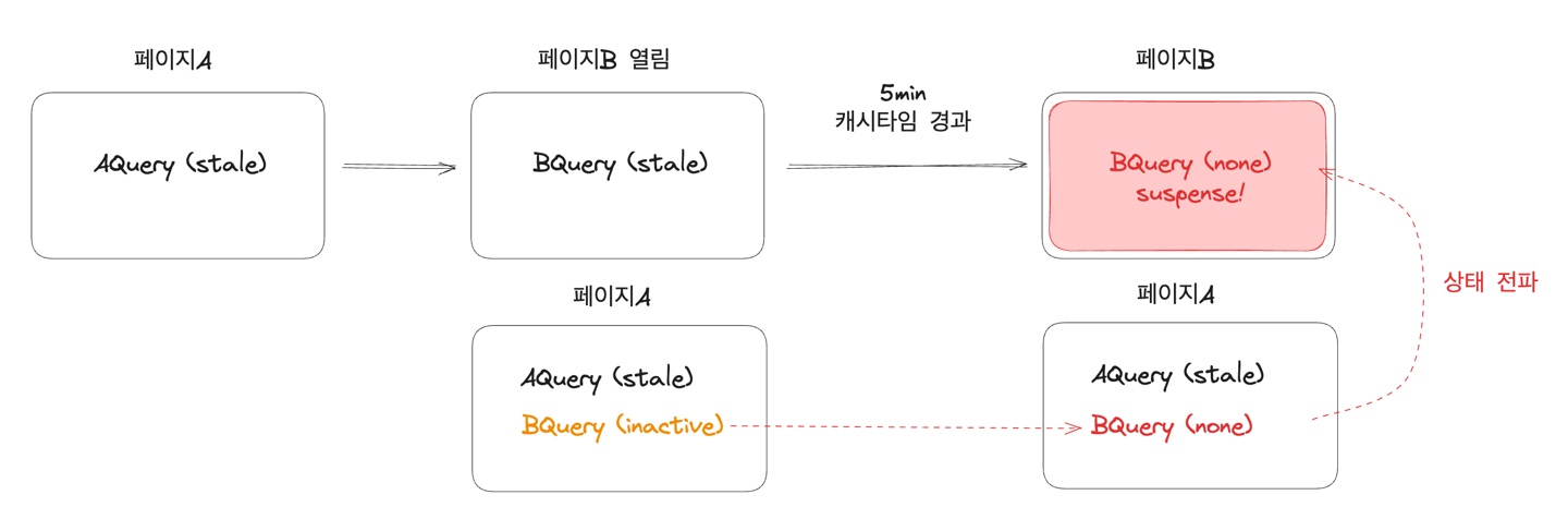 fresh 상태라도 사용 중인 컴포넌트가 없으면 `inactive` 상태가 될 수 있음.페이지A와 페이지 B에는 서로 동일한 쿼리를 공유하고 있었는데, 페이지A에서 사용되지 않는 쿼리가 5분이 경과해 inactive상태가 되고, cacheTime이 지나 결국 삭제된 거에요. 이 때, 삭제된 쿼리의 상태가 페이지 B로까지 전이된 것이었어요.