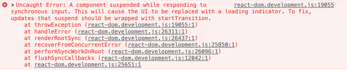 To fix, updates that suspend should be wrapped with startTransition.이 에러 메세지는 컴포넌트가 suspense를 일으킬때 나타나는 에러메세지인데, 보통 토스 프론트엔드 환경에서 suspense가 일어났다는 것은 곧 "준비되지 않은 쿼리가 있음"을 의미해요. 컴포넌트 렌더 시점에 컴포넌트에서 캐시가 존재하지 않는 쿼리를 사용할 때 일어나는 에러에요.